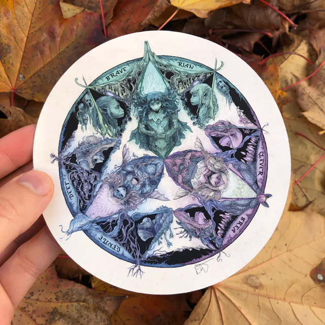 Large 12 cm (4,7 inches) circular vinyl sticker of an artwork I made for the 3rd anniversary of The Dark Crystal - Age of Resistance show. The sticker is repositionable and waterproof.